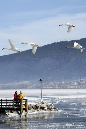 23日,在瑞士沃州的某一小村莊——勒桑捷,有一對男女正在瞭望在湖水上面飛翔的天鵝。