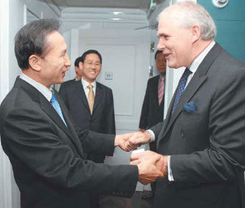 李明博總統當選人(左)和國家競爭力強華特別委員會David Gordon Eldon共同委員長,在5日早餐之前正握手問好。在這裏李當選人向Eldon委員長委託了積極引進外國人投資的活動。