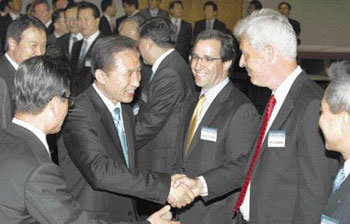 9日,李明博總統當選人參加了在首爾中區明洞銀行會館召開的金融人士討論會,與SC銀行行長戴衛•愛德華等金融界高層人士進行了談話。