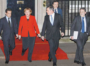 英國、法國、德國、義大利等歐盟的主要4個成員國的首腦,29日(當地時間)結束峰會後,從英國倫敦唐寧街外交部大樓走出來。他們通過峰會後發表共同聲明,改善了預測世界金融市場下降的早期警報預警系統,並敦促金融以及信用評價機關公開信息的透明化。前排從左到右分別為法國總統薩克奇、德國總理默克爾、英國總理戈登布朗、義大利總理普羅迪。後排的則為EU執行委員長巴羅佐(Jose Manuel Barroso)。
