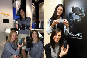 全球移動業界盛宴“巴賽隆納Mobile World Congress展覽會2008”開幕前一天的10日(當地時間),三星電子公司和LG電子公司在西班牙風格的展館展位中亮相了尖端科技的手機新產品。模特們的手中展示著三星電子(左)生產的音樂手機和觸摸手機以及LG電子生產的Viewty手機。