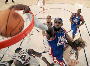 2006年全明星賽的最優秀選手勒布朗.詹姆斯,去年把獎盃拱手讓給了科比(湖人隊),但今年又重新獲得了獎盃,並登上了“王中王”的獎台。