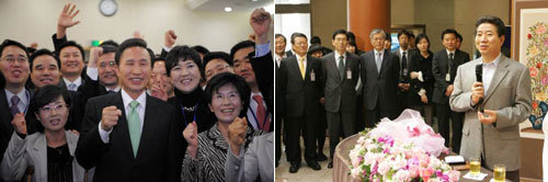 25日,青瓦台的主人就要變了。舊主人表現沉穩,新主人滿面笑容。李明博總統當選人22日在接任委員會解散儀式上大喊“加油”(左)。盧武鉉總統當天參加了出入記者團告別午餐,向與會者們致詞。