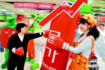 9日,大型折扣店“HOMEPLUS”在其首爾永登店,為因高價感到壓力的主婦們提供了可以向代表高物價的沙袋發洩的“減壓區”。這一折扣店從6日開始,在全國66個賣場以低於平均10%的價格提供103種本國的蔬菜水果。