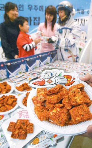包裝泡菜的品牌——宗家府,10日在首爾龍山區漢江路3街龍山站,給市民饋贈了用宇宙食品工藝製作的泡菜、大醬和辣椒醬等3個系列的產品。