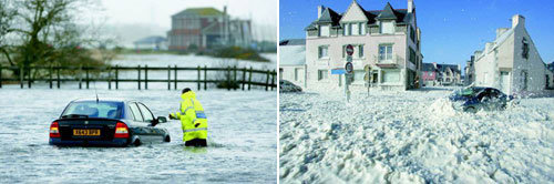 10日,因狂風暴雨變成水世界的英國罕布希爾地區,解救人員正乘風破浪想盡辦法接近孤立無援的車輛(左圖)。因時速超過130公里的此次風暴,英國南部地區接連發生了樹木被沖走、電線杆倒塌等破壞。另一方面,當天狂風帶來的大海泡沫也襲擊了法國西部岸邊小鎮,駕駛人正迎著大海泡沫駕駛車輛。因此次暴風甚至有新西蘭貨船被沖上法國布列塔尼地區海岸。