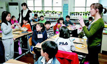 首爾市教育廳制定的英語教學指定學校——首爾光鎮區光南小學的學生們,24日正在班主任和英語教師(右)的指導下上英語數學課。