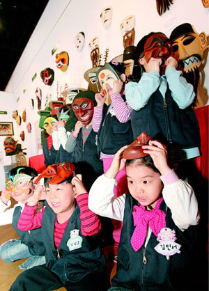 戴著下回等傳統面具玩耍的孩子們。27日,位於首爾松坡區蠶室樂天商廈的民俗博物館裏召開了“韓國,亞洲傳統面具體驗館”。