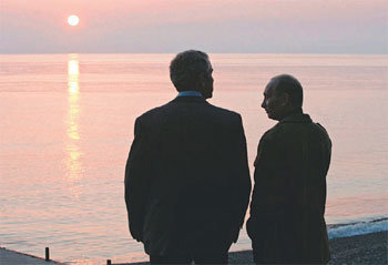 5日,美國總統喬治W布希(左)和俄羅斯總統費拉基米爾-普京在俄國黑海沿岸的Sochi港口一邊欣賞夕陽,一邊進行談話。兩位總統在此處普京總統的別墅有關東歐導彈防禦(MD)體制的構築問題和擴大北大西洋公約組織(NATO)等問題進行了商議。