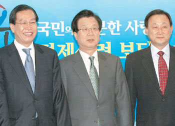 16日,大國家党姜在涉代表(中間)在首爾永登浦區汝矣島洞祠堂中,給新當選的事務總長權甯世(左),第一事務副總長李明久等人授予了任命章。