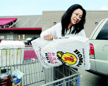 目前,世界各地的糧食危機逐漸上升。美國的大型連鎖零售商好市多,根據消費者以往的糧食購買力,開始採取限制糧食出售量的措施。23日,來到美國加州好市多超市的顧客傑娜•利尤正在把一袋大米搬運到汽車上。