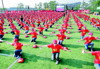 24日,為迎接北京奧林匹克,新上崗的速食連鎖店麥當勞的職員,在奧林匹克公園挑起了集體舞。在中國有810家分店和約有5萬多名職工的麥當勞,打算此後將在中國每年增加100名職員。