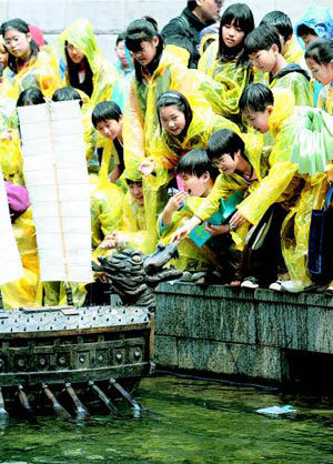 25日,迎接忠武公李舜臣將軍誕辰463周年,首爾清溪泉召開了“模型龜船大賽”,前來參加活動的孩子們,正興高采烈地玩著模型龜船。中區廳舉辦的當天的活動,共有360名小學生參加。