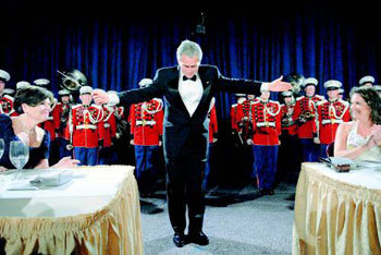 26日,在白宮記者團周年晚餐中,指揮完“永垂吧,星條旗”後,美國總統喬治布希正向觀眾行禮致敬。當天,布希總統以共和黨大選候選人麥卡恩上議員的未出席發表“他可能想和我保持距離”等,發揮他特有的幽默,逗笑了記者。