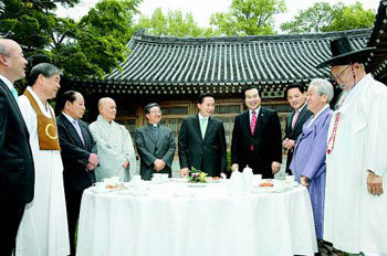 이명박 대통령이 29일 청와대에서 7대 종단 대표들과 오찬간담회를 갖기에 앞서 차를 마시며 이야기를 나누고 있다. 왼쪽부터 이성택 교정원장(원불교), 김동환 고령(천도교), 지관 조계종 총무원장(불교), 김희중 주교(천주교), 이 대통령, 엄신형 한국기독교총연합회장(기독교), 유인촌 문화체육관광부 장관, 최근덕 성균관장(유교), 한양원 한국민족종교협의회장.