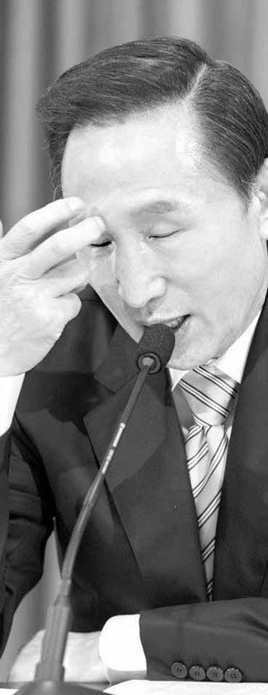 6日,在青瓦台召開的國家科學技術委員會會議中,李明博總統向大家問好時不禁擦拭了眼角。