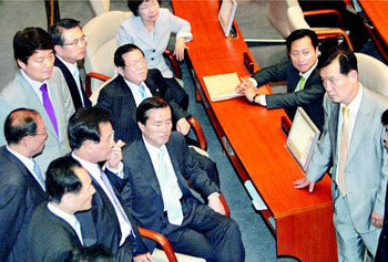 23日,對農林水產食品部鄭雲天長官的解雇案被否決後,在國會總會場看到選票結果的統一民主黨議員們,圍在院內代表金孝錫(中間)周圍商量日後對策。