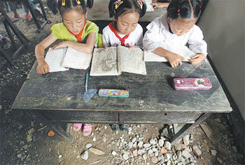 1日,中國四川省綿陽市安具秀水村的孩子們在一所因地震而倒塌的小學裏臨時準備的教室讀書。2日,中國政府成立了負責這次地震被害地區重建的“汶川地震重建組”,表示將在三年內結束重建工作。法國興業銀行推算,大地震重建工作大概需要600億美元(約62兆韓元)。