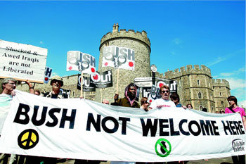 告別巡防歐洲中的喬治•布希美國總統,15日訪問了英國。在這裏,他仍因大規模反戰示威,而深陷困境。15日,反對戰爭的英國市民團體會員們,正在溫莎宮前面,高舉“布希不受歡迎”的大型橫幅來進行示威。