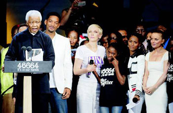 紀念下個月18日前南非總統曼德拉的90歲生日的“46664愛滋病基金籌款慈善音樂會”上,曼德拉前總統正在進行演講。維爾•斯密斯(左二),安妮•雷諾斯(左三)等多位著名演員出席了共吸引5萬多名觀眾到場的音樂會。音樂會的“46664”數字是曼德拉因為反對人種歧視,而被入獄長達27年之久時的犯人編號。
