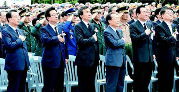 大國家党薑在涉,統一民主黨代表孫鶴奎,自由先進党總裁李會昌,親博聯隊徐清源,創造韓國黨代表聞國現(左起)於29日出席了在京畿島平澤海軍二艦隊司令部召開的第地延平海占紀念儀式,進行國民儀禮。