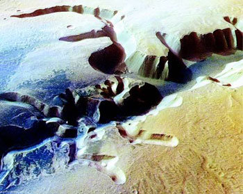 為向人們展示火星水痕,歐洲航天局(ESA)14日公開的查斯馬地區圖。查斯馬位於火星北部,是長達3000公里的凱希穀發源地之一。圖為火星勘察船“火星快車”用高清晰立體攝影機拍出的圖片。