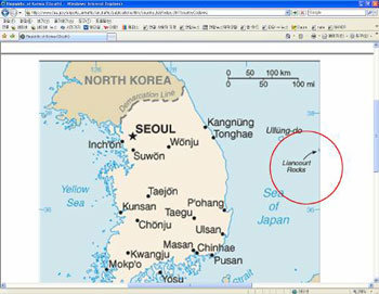 美國地名委員會把獨島當作“沒有主人的土地”。這是美國聯邦航空局在主頁上把獨島標成“竹島(Liancourt Rocks)”(紅色圓內)的畫面。“竹島(Liancourt Rocks)”是日本為了擁有獨島而使用的名稱。
