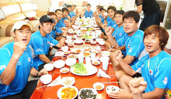 “吃好才有力氣。”韓國男子曲棍球代表隊選手們7日在北京市內韓國選手團的休息樓裏一起吃著烤肉、生菜包飯等,喊著加油。