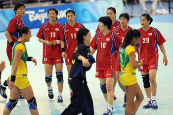 15日,在北京奧運會體育中心舉行的女子手球小組賽B組比賽中,韓國隊以一分之差輸給巴西,韓國選手遺憾的走出賽場。