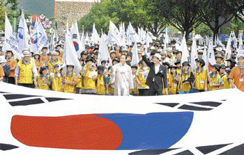 15日,建國60周年及光復63周年紀念儀式結束後,身著韓服的李明博總統(前排中間)參加了“國土大長征,大未來行進”活動。並與國會議長金炯旿(前排右邊)及學生一起揮舞著太極旗,從首爾鐘路區世宗路光化門走向首爾政府大樓廣場。