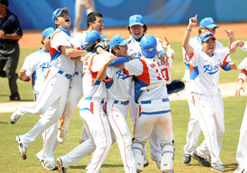 “沒有比棒球晉級決賽更喜悅的事情”。2008北京奧運會棒球半決賽,韓國棒球代表隊以6比2戰勝日本隊,獲得勝利的韓國隊正在互相擁抱,歡呼著。 2比2平分的第8局李承燁選手擊出一支本壘打獲得2分,隨後韓國隊乘勝追擊,首次晉級奧運會決賽。