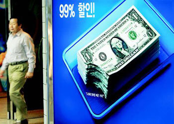 本月6日,首爾外匯市場的韓元匯率繼6年零5個月之後,以1269.80韓元再創高峰,讓金融市場再次動盪。位於首爾鐘路的一家支行,將一幅看板貼在銀行入口側,而看板上則寫有:此銀行的顧客可以享受大幅匯率優惠。
