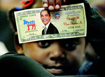 19日,在美國北卡羅來納州召開的民主黨大選遊說活動現場,支持奧巴馬候選人的一名少年出示了印有奧巴馬照片的面值100萬美元的假幣。