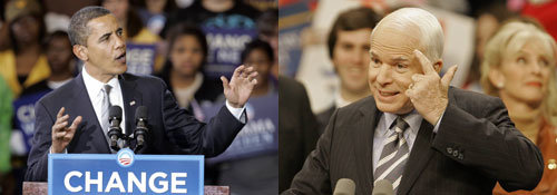 28日,美國大選民主黨候選人奧巴馬在佛吉尼亞州的詹姆士麥迪森大學進行演說(左邊)。同時,共和黨候選人麥凱恩在北卡羅來納州菲也特維爾舉行的演說中手摸額頭大笑著。