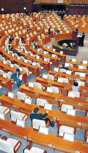 因薑萬洙企劃財政部長官的“接觸憲法裁判所”發言而中斷的國會經濟領域“大政府質問”會議7日經過執政黨、參政黨真相調查委員會協議後,當日下午又重新召開。不過參與本會的國會議員卻寥寥無幾。因此人們批判說,世界金融危機下應該尋找克服方案的國會議員卻挑剔長官發言,不僅沒有參與國會“大政府質問”會議,而且根本不關注經濟領域。