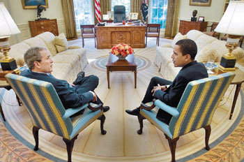 美國總統當選人奧巴馬(右)10日被當選後首次訪問了白宮,在總統辦公室與布希總統進行了對話。當天,兩人討論了政府對美國汽車領域的支援方案,但未能達成一致意見。