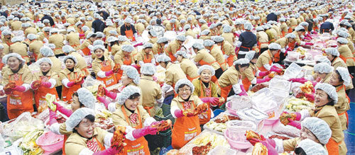 20日下午,2000多名“優酪乳大嫂”們聚集在首爾市政府前的首爾廣場,醃制了計畫送給困難家庭的“愛之泡菜”。她們當天共醃制了5萬8000棵泡菜,創下了同一個地方醃制泡菜最多的吉尼斯紀錄。直到今年,韓國優酪乳公司的“分享愛之泡菜”的活動已經持續了8年。