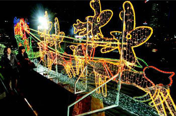 30日,首爾中路生活書店前市民正在觀賞華麗的耶誕節照明。魯道夫和聖誕老人的雪撬雖然十分美麗耀眼,但因經濟危機而疲憊的市民們卻感覺不到溫馨。