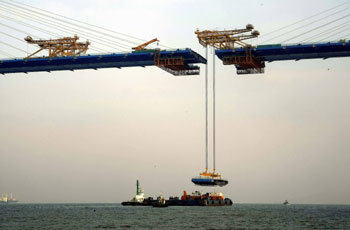本月16日,開始了在仁川大橋主橋斜拉橋之間,連接長達12.3米,寬為33.6米,重達188噸的最後板塊工程。仁川大橋將于明年10月開通,總長達八百米,是國內最長,在全世界長度排名位居第五的大橋。仁川大橋將連接永宗島與國際之都松島。