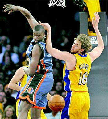 第一節開賽,夏洛特山貓隊的德薩蓋納•迪奧普(左側)和洛杉磯湖人隊的保羅•加索爾,正在拼命爭奪籃板球,可惜兩人都沒有搶到。最後,夏洛特山貓隊以117比110戰勝洛杉磯湖人隊。