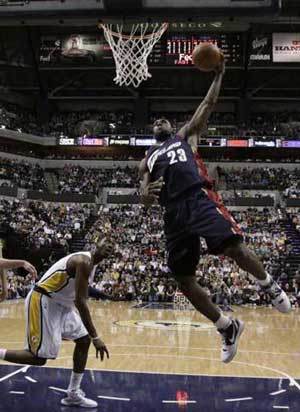 克裏夫蘭騎士隊的勒布朗•詹姆斯(右)11日在與印第安娜步行者的客場比賽中閃過了羅伊•希伯特,試圖打進漂亮的單手扣籃。但是詹姆斯在比分為95比95的比賽結束前0.2秒犯規,成為了以95比96敗北的元兇。