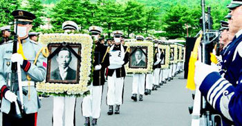 13日,國家報勳處在首爾銅雀區的國立墓地,舉辦了安葬在海外的6具愛國先烈遺骸的奉還儀式。儀式結束後,為了把遺骸安葬在大田國立獻忠院,國軍儀仗隊正搬運愛國先烈的遺骸。