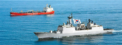 16日上午(當地時間),為保護韓國的船隻與船員而派遣至索馬裏海域的青海部隊文武大王艦(前方),首次進行了護航。韓國護航隊的任務是,在海盜出沒的波斯灣地區保護乘有11名韓國船員的巴哈馬國籍的船隻抵達吉布提海域。