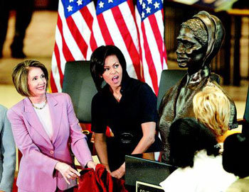 버락 오바마 미국 대통령의 부인 미셸 여사(가운데)와 낸시 펠로시 미 하원의장이 28일 미국 워싱턴 의사당 해방홀에서 열린 흉상 제막식을 지켜보고 있다. 흉상의 주인공은 남북전쟁 당시 여성선거권과 노예제도 폐지를 주장했던 흑인 여성운동가 소저너 트루스. 흑인 여성의 흉상이 미 의회에 설치된 것은 이번이 처음이다. 미셸 여사는 노예 후손으로 미국 최초의 흑인 대통령부인이 된 나를 보고 긍지를 가졌으면 한다고 말해 박수를 받았다.
