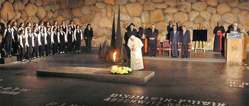 正在訪問以色列的教皇本篤十六世(中間,身穿白色衣服)11日在耶路撒冷的大屠殺紀念館中悼念了在第2次世界大戰中被納粹所殺害的600萬名猶太人。教皇好像想到了以前因為類似否認大屠殺的發言而引發猶太人憤怒的事件,當天強調說:“誰也不能否認犧牲者們的痛苦。”