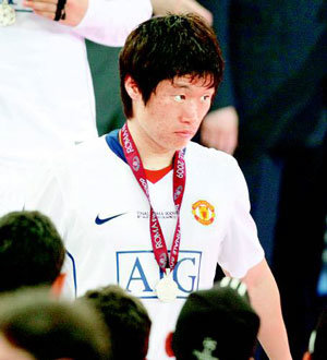 曼聯球員樸智星,身掛亞軍獎牌,滿臉遺憾的走下頒獎台。