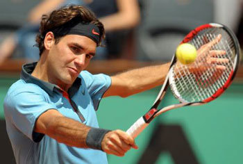 2日,在巴黎舉行的法國網球公開賽16強比賽上,“網球天皇”費德勒正在穩定的反手擊球。先敗兩局的費德勒,最終以3比2逆轉,離大滿貫更近一步。