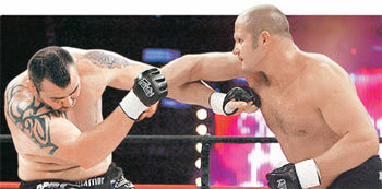“格鬥皇帝”菲德爾•艾米連科(右側),源於全世界最強人類的比喻,被稱為“60億分之1”。圖為,菲德爾在去年7月的“Affliction Band”大賽上,對Timothy Sylvia(美國)揮出右拳重擊。菲德爾在36秒內KO對手,獲得了勝利。