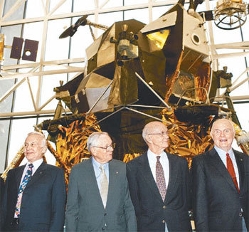 19日(當地時間),史密斯國家博物館群美國國家航空航太博物館中,1969年搭乘阿波羅11號的宇航員們,在登月(7月20日)40周年之際的簽名會上,歡聚一堂。從左開始,是登月艙“鷹”號駕駛員,第2個踏上月球的巴茲•奧爾德林;阿波羅11號艦長,同時也是首位登月宇航員尼爾•阿姆斯壯;當時指令艙“哥倫比亞”號駕駛員邁克爾•柯林斯;和1988年以77歲的高齡搭乘發現號太空梭,曾為最高齡宇航員的約翰•葛籣參議員。