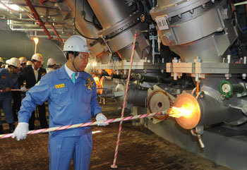 浦項制鐵公司(POSCO)在重啟光陽4號高爐之後,首次打開了單一高爐年產500萬噸的時代。浦項制鐵公司(POSCO)的會長鄭俊陽21日在光陽4號高爐點火儀式上,正在給重啟的高爐點火。